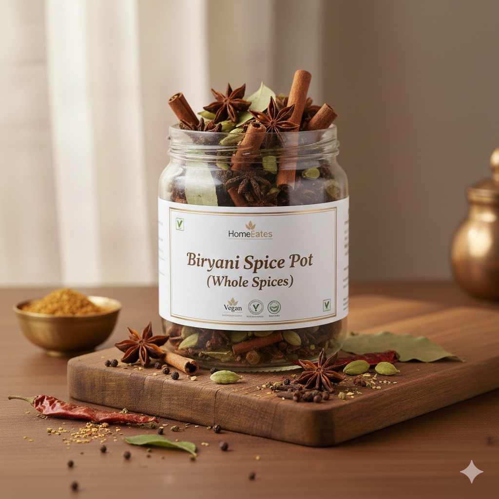 A curated bouquet of whole spices for the perfect Biryani aroma. Includes Shahi Jeera, Star Anise, Stone Flower, Mace, and premium Cardamom. These are sourced directly from plantations in Idukki and packed in a way that they can be dropped directly into your boiling rice water. No more hunting for individual spices.