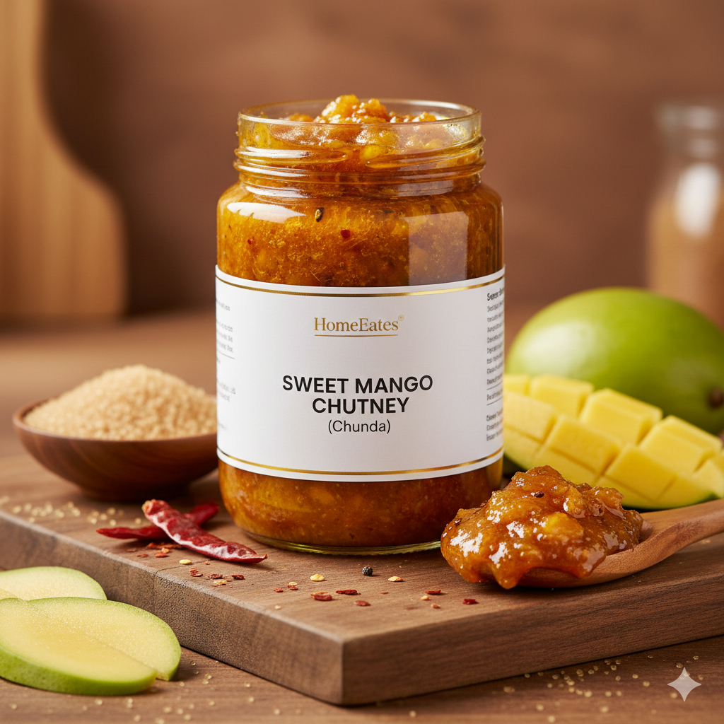 A Gujarati household staple, our Chunda is a sweet and sour mango preserve. Grated raw mangoes are traditionally cured in the sun with sugar and spices until they reach a jam-like consistency. Infused with roasted cumin and red chili powder, it’s the perfect companion for parathas, theplas, or even on a slice of bread.