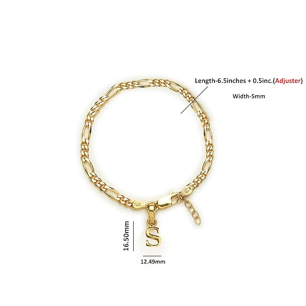 22KT gold plated 92.5% pure Sterling Silver Figaro Designer Bracelet with Alphabet Pendant for Girls and Women
