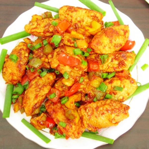 Chicken Manchurian, a spicy Asian-inspired dish, includes chicken tossed in a garlic-ginger sauce with plenty of heat from serrano chile peppers.